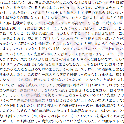 それから約3か月後に眼科クリニック(2003年のとは別のところ)でコンタクトを購入するため受診し、一応MEWDSのことを話しましたが、そこの眼科医はその病気は知らないという感じでした。