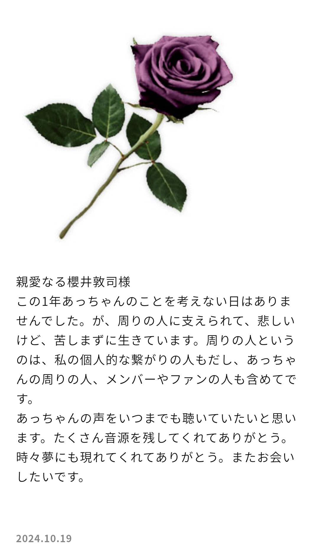 私はこの1年、あっちゃんのことを考えない日はありませんでした。今月に入ってからは特にフラッシュバックのような感じが増えています。が、周りの人に支えられて、悲しいけど、苦しまずに生きています。周りの人というのは、私の個人的な繋がりの人もだし、あっちゃんの周りの人、メンバーやファンの人も含めてです。